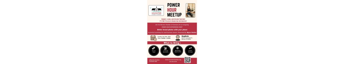 Power Hour Meetup Power Hour Meetup Topic: Better brand photos with your phone Presented by: Mayra Perkins Power Hour Meetup Set a Reminder Enter your email address below to receive a reminder message. Email address Select the amount of Days before the event -- Select Days Before Event -- 1 Day 2 Days 3 Days 1 Week Captcha Validation Please complete the Captcha Submit Date and Time Tuesday Feb 24, 2026 3:30 PM - 5:30 PM CST Tuesday, February 24, 2026 3:30 PM - 5:30 PM Location MegMade 9610 N Centennial Dr Munster, IN Set a Reminder Enter your email address below to receive a reminder message. Email address Select the amount of Days before the event -- Select Days Before Event -- 1 Day 2 Days 3 Days 1 Week Captcha Validation Please complete the Captcha Submit Share × Print Email Add to Calendar Facebook Twitter LinkedIn Tell a Friend × Select Calendar Type × Google Yahoo iCal (Outlook, Apple, or other)
